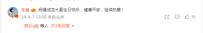 另一个奉上诞辰祈福的是演员李晨,他在成龙指摘区写下“祈福成龙年老诞辰本心,健康祥瑞,不竭宠爱!”